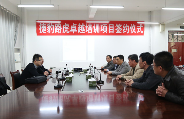 首先,捷豹路虎汽车贸易(上海)有限公司经理俞政栋先生介绍了项目合作后将为我院提供的设备、业务等方面的投入,同时对我院在该项目的硬件、软件方面的准备工作提出了要求和建议。随后,院长尹桂瓒代表学院致辞,他从项目的场地建设、资金投入、师资优势、组织开课、学生就业等方面提出了建设性意见,并对学院和捷豹路虎卓越培训项目的良好合作寄予了美好憧憬和期待。最后,捷豹路虎汽车贸易(上海)有限公司经理俞政栋先生与学院尹桂瓒院长共同签署了合作协议。
