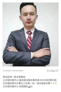 5.2018年9月,现服务于兰州保时捷中心的服务顾问颜忠鲁获得2018保时捷中国北区服务顾问大赛北三区第一名;成功晋级决赛。