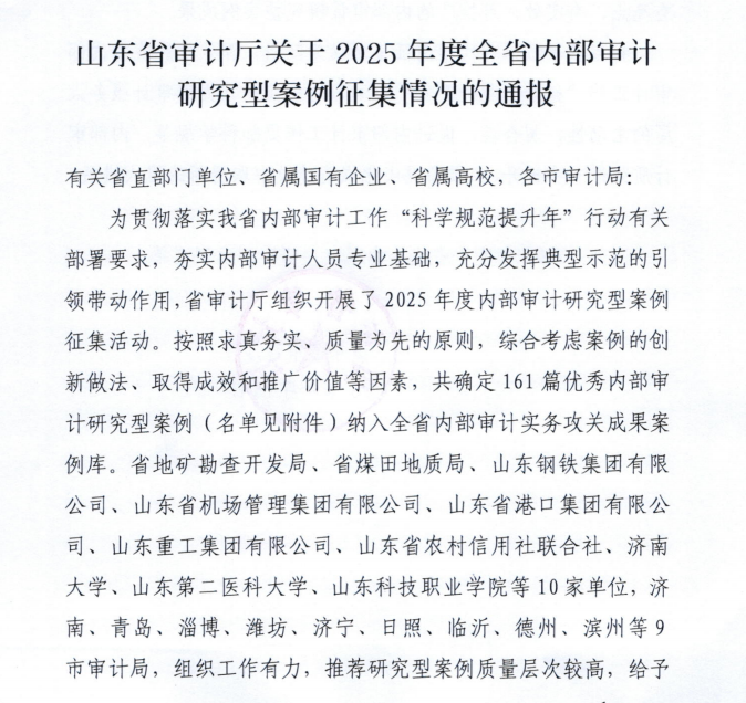 近日,山东省审计厅公布2025年度全省内部审计研究型案例征集评选结果,我院申报的内部审计案例经过严格评审,荣获优秀案例。此次获奖是我院深入贯彻我省内部审计工作“科学规范提升年”行动要求,扎实推进内部审计建设取得的又一重要成果。