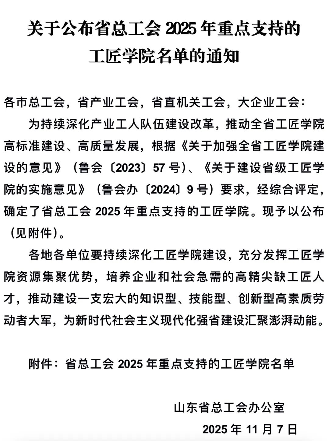 近日,山东省总工会公布了2025年重点支持的工匠学院名单,烟台汽车工程职业学院工匠学院凭借扎实的工作基础和突出的建设成效,成功入选!
