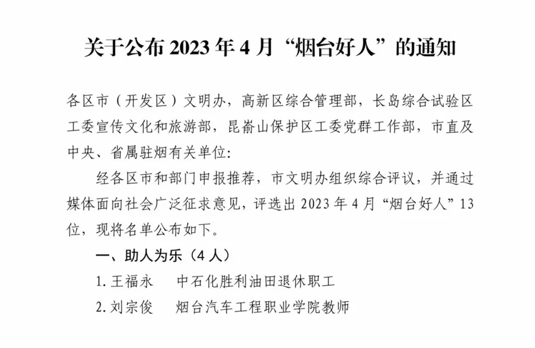 5月4日,烟台市精神文明建设委员会办公室发布《关于公布2023年4月“烟台好人”的通知》,公布了包括助人为乐、见义勇为、诚实守信、敬业奉献、孝老爱亲五大类13位好人名单,由学院工会和福山区清洋街道办事处推荐的学院教师刘宗俊榜上有名,被烟台市文明办授予助人为乐“烟台好人”。