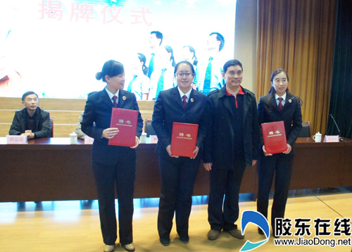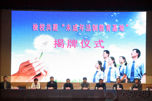 烟台汽车工程学校刘代忠校长与福山区检察院副检察长崔洪岩分别致辞。刘代忠校长首先代表烟台汽车工程学校全体师生向关心和帮助青少年普法教育事业的领导及社会各界表示衷心的感谢,指出校检共建是开拓校园法制教育的新途径,能够使我校广大未成年人树立社会主义法治观念,提高未成年人学法、知法、守法、用法、护法的能力,预防和减少未成年人违法犯罪;并且通过我们的不懈努力,唤起全社会的关注和爱心,齐心协力地推进未成年人法制教育。福山区人民检察院副检察长崔洪岩在讲话中对校检共建“未成年法制教育基地”的建立表示祝贺,指出这是防止和减少青少年犯罪的又一个崭新平台。随后,举行了授聘仪式,尹桂瓒院长为法制副校长崔洪岩,法制辅导员连仁妮、陆阳,心理辅导员黄晓东颁发了聘书。福山区人民检察院检察长陈勇为未成年人权益保护志愿者孙圣雅老师和李娜老师颁发了聘书。然后烟台市人民检察院副检察长傅延威、福山区委副书记李晓明为校检共建“未成年法制教育基地”揭牌