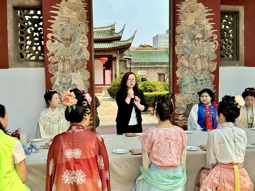 活动中,学生们身着古风服饰,在雕梁画栋的天后行宫内复原宋代蚌粉铃、制作端午节五彩绳,亲身体验传统手工艺的魅力。经济管理系24级市场营销三班张慧萍同学表示:“通过钩织社团的现场教学,我们不仅学会了五彩绳的制作技艺,更深刻理解了端午节的文化内涵。”这些实践环节正是学院将非遗传承融入第二课堂的生动体现。近年来,经济管理系通过开设传统文化选修课、组建汉服社团等形式,引导学生从“旁观者”变为“传承者”,让非遗技艺在青年群体中焕发新生。
