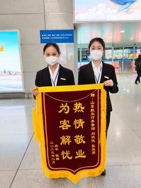2023年2月25日下午,旅客赵女士一家手持一面写着“热情敬业 为客解忧”的锦旗,来到烟台蓬莱国际机场向交通系20级实习生刘欣悦、张亚男连连道谢。