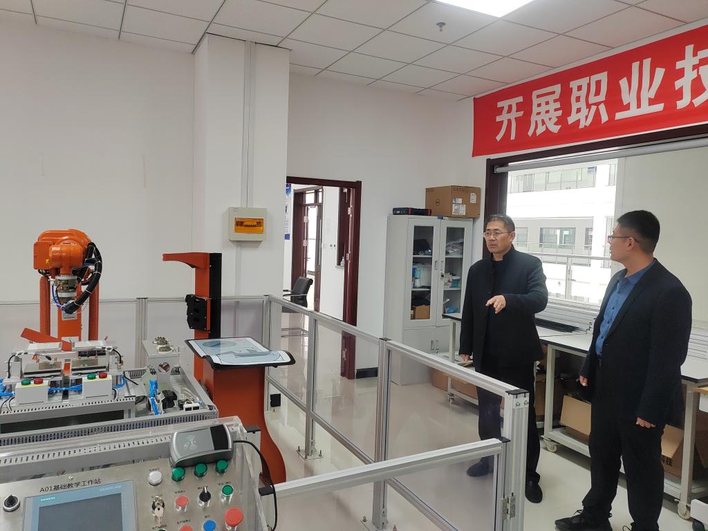 首先,在烟台职业学院电气与电子工程系副主任李鹏的陪同下,调研组一行参观了该校产教融合工程中心,随后在系会议室举办了座谈会。电气与电子工程系主任栾春光,副主任李鹏、张海丹及教研室主任等9人出席了座谈会,栾春光对学院电子工程系调研组的到来表示热烈欢迎,李鹏和陈晓宝分别对各自系部进行了介绍,随后双方就专业建设、实训基地、师资培养、科研服务、技能大赛等方面进行了深入交流。